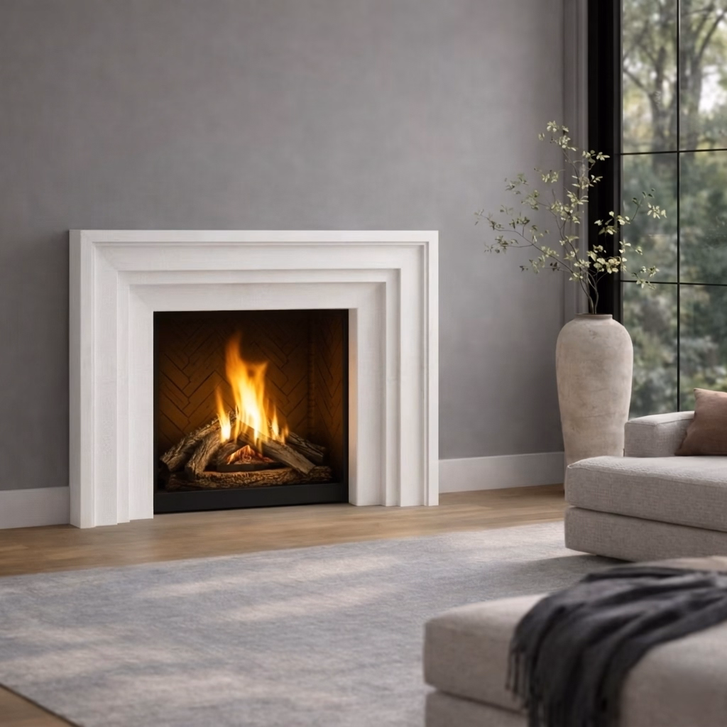 The Ashley fireplace mantel surround by Lyonstone combines charm and warmth in a timeless stone design. Defined by smooth lines and subtle detailing, Ashley brings an inviting presence to the room without feeling overly formal. Its balanced look pairs beautifully with shiplap walls, neutral palettes, and relaxed interiors, making it a natural focal point for comfortable, welcoming living spaces. Designed for homeowners and designers seeking a mantel surround with softness, versatility, and lasting appeal, the Ashley blends understated character with everyday livability. Customization options are available to suit your space and design needs.