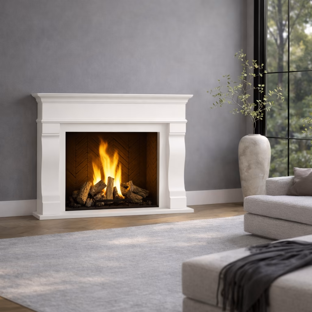 The Sechelt fireplace mantel surround by Lyonstone blends rustic charm with a clean, modern design. Its subtle details and smooth finish bring warmth to the room without overpowering the space, creating an inviting focal point with versatile appeal. Sechelt works beautifully with farmhouse textures and cozy interiors, making it a natural fit for comfortable, well-layered living spaces. Designed for homeowners and designers seeking a fireplace surround with understated character, warmth, and lasting appeal, the Sechelt combines simplicity with everyday livability. Customization options are available to suit your space and design needs.